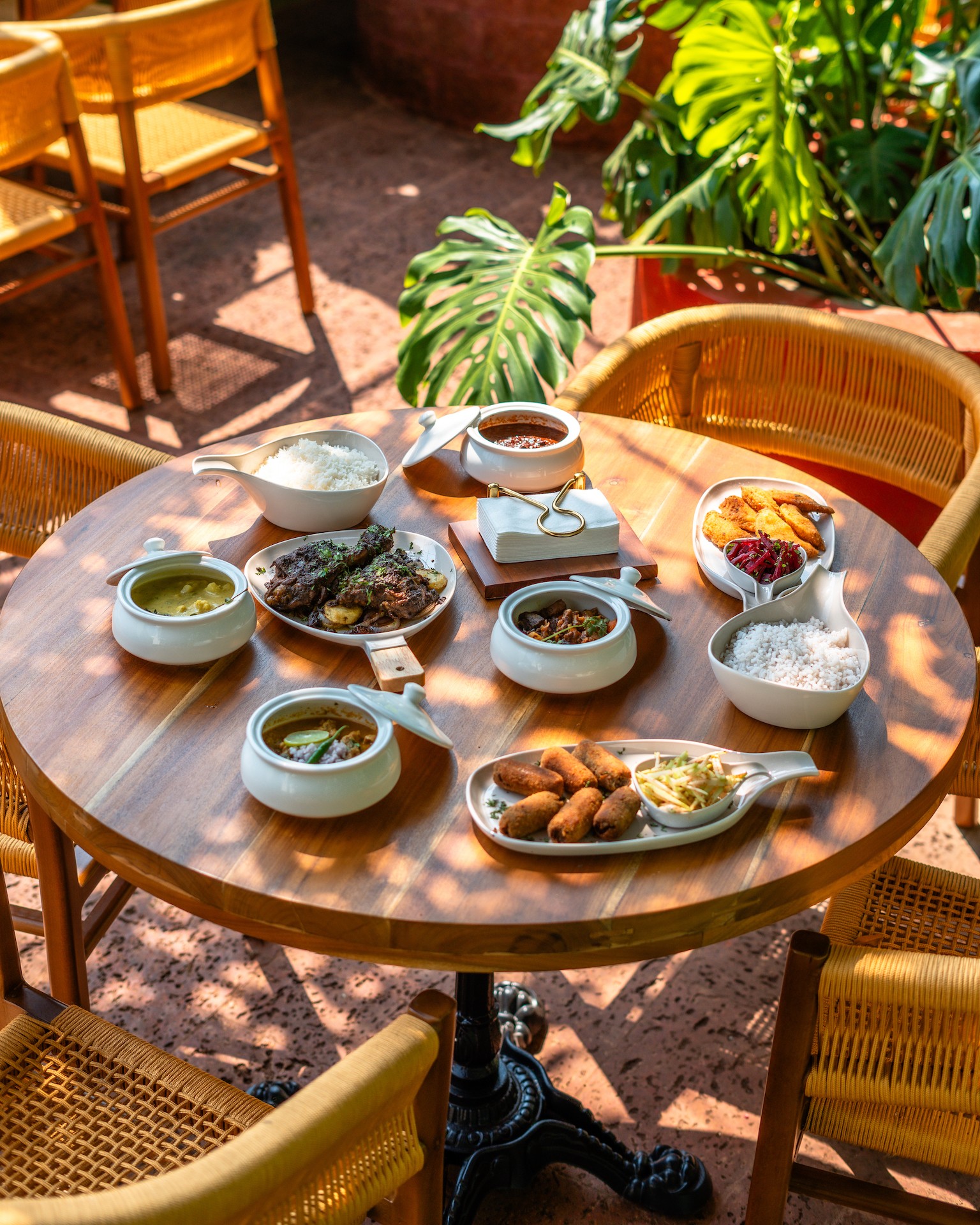 The weathered Portuguese door creaks open, and suddenly you’re in another era. Inside, it’s all muted nostalgia, terracotta floors that softly creak underfoot, walls wearing their age like vintage lace, and cane lights glowing in a way that’s neither too earnest nor too affected. The kind of place where the walls whisper stories of Goa’s entangled history, Portuguese sailors, African traders, Indian spice merchants, all leaving their footprints on the menu. Wander further, and you’ll find a little hidden garden, starring an ancient chiku tree that’s still been generous enough to bear fruit, as if whispering secrets from its roots.