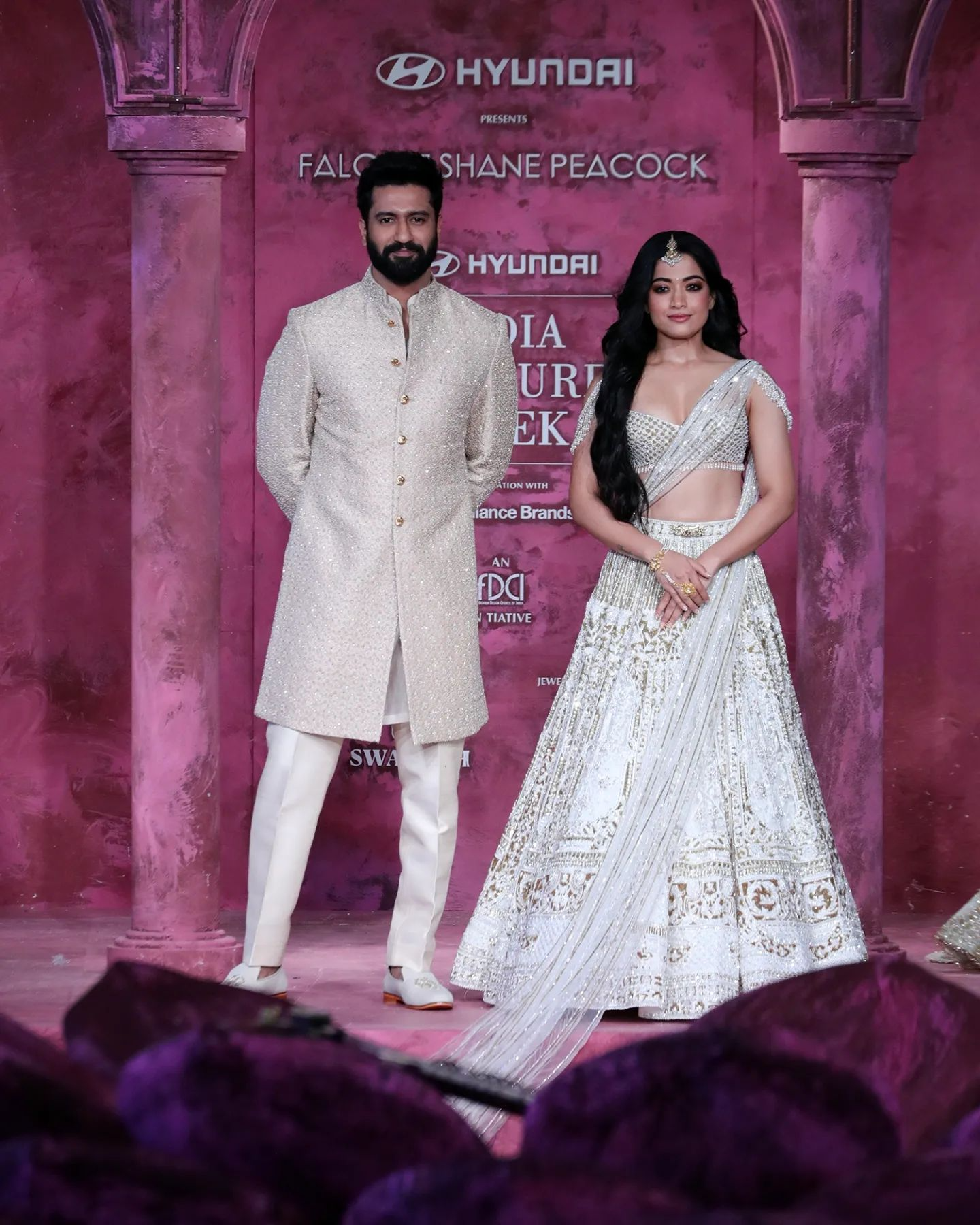 The grand finale of Hyundai India Couture Week 2024 was nothing short of spectacular, with Vicky Kaushal and Rashmika Mandanna gracing the runway for Falguni Shane Peacock. The power couple set the stage ablaze as they showcased the designer duo’s opulent “Rang Mahal” collection. Inspired by India’s royal heritage, the designs were a breathtaking blend of luxury and tradition, adorned with intricate embroideries and rich fabrics. It was a night of glamour, fashion, and pure star power.