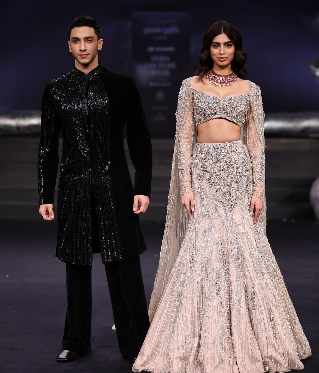 Day 6 of India Couture Week was a spectacle of hope and renewal as Gaurav Gupta unveiled his collection, “Arunodaya.” Inspired by the early dawn, the designer painted a breathtaking canvas of colors and textures. Intricate Zardozi embroidery met surreal lines, creating a mesmerizing symphony of design. The ramp came alive with Khushi Kapoor and Vedang Raina, showcasing the collection’s ethereal beauty.