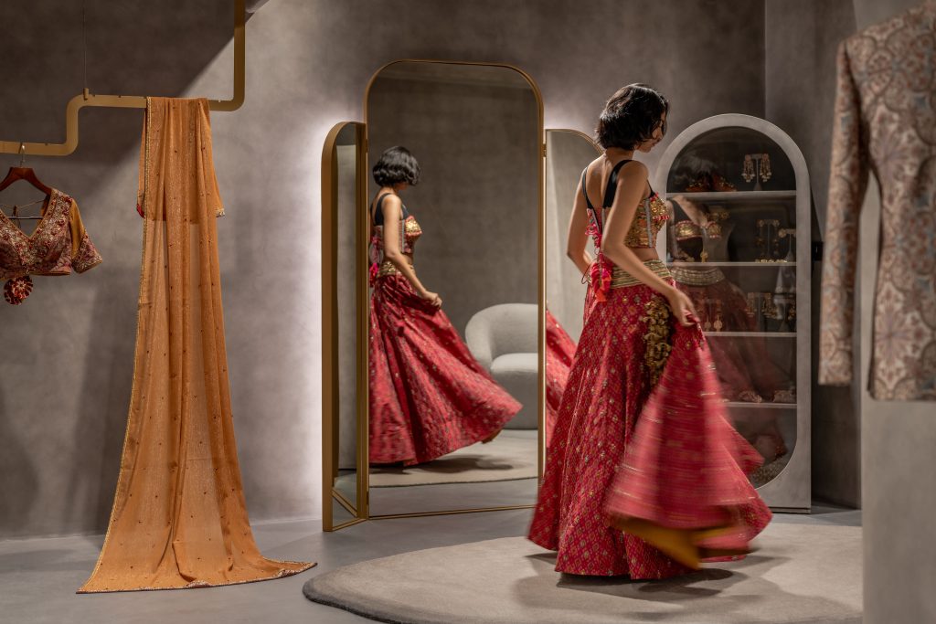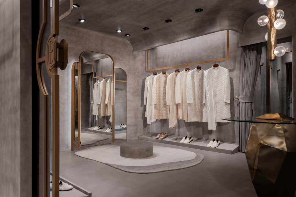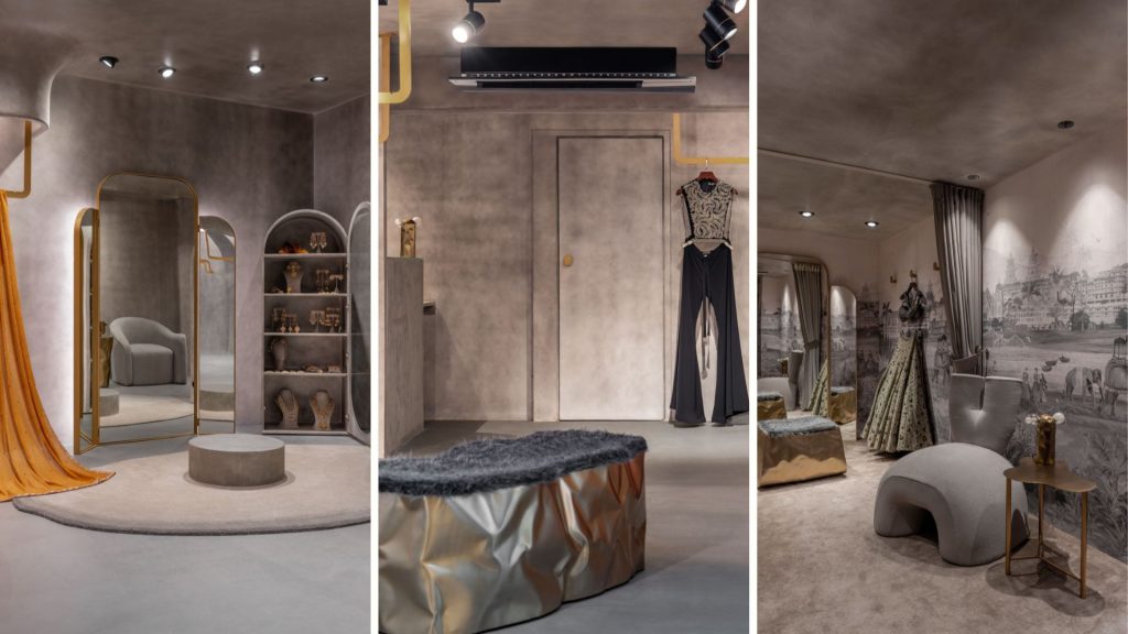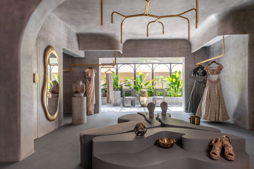 Natural light and greenery play a pivotal role in softening the store’s sculptural interiors. A conservatory-inspired space punctuates the layout, inviting daylight to filter through, creating a shifting interplay of light and shadow throughout the day. The trial room, often an afterthought in retail design, is given equal weight—lined with heritage wallpaper by Kalakaari Haath and a plush, striped carpet runner from Jaipur Rugs, the space is designed to feel as considered as the garments on display.