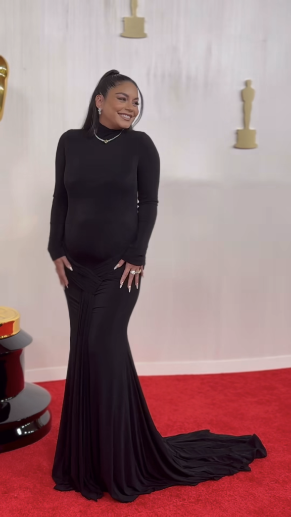 Vanessa Hudgens stepped onto the Oscars red carpet with a gorgeous glow announcing her pregnancy. She also had the help of a natural diamond glow wearing a white diamond necklace with a yellow diamond center stone, statement line earrings, and a stack of natural diamond rings from Chopard.