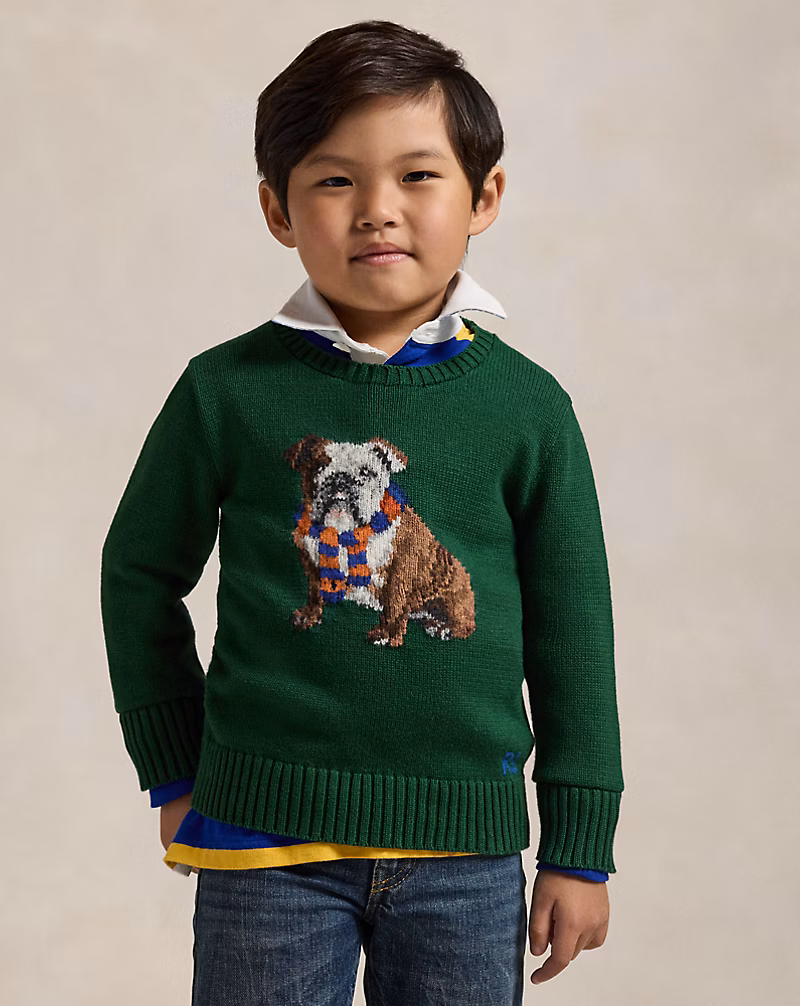 This dark green sweater is just the knitwear a kid needs this winter. The adorable French bulldog in a scarf on the front might inspire them to get a real one at home.