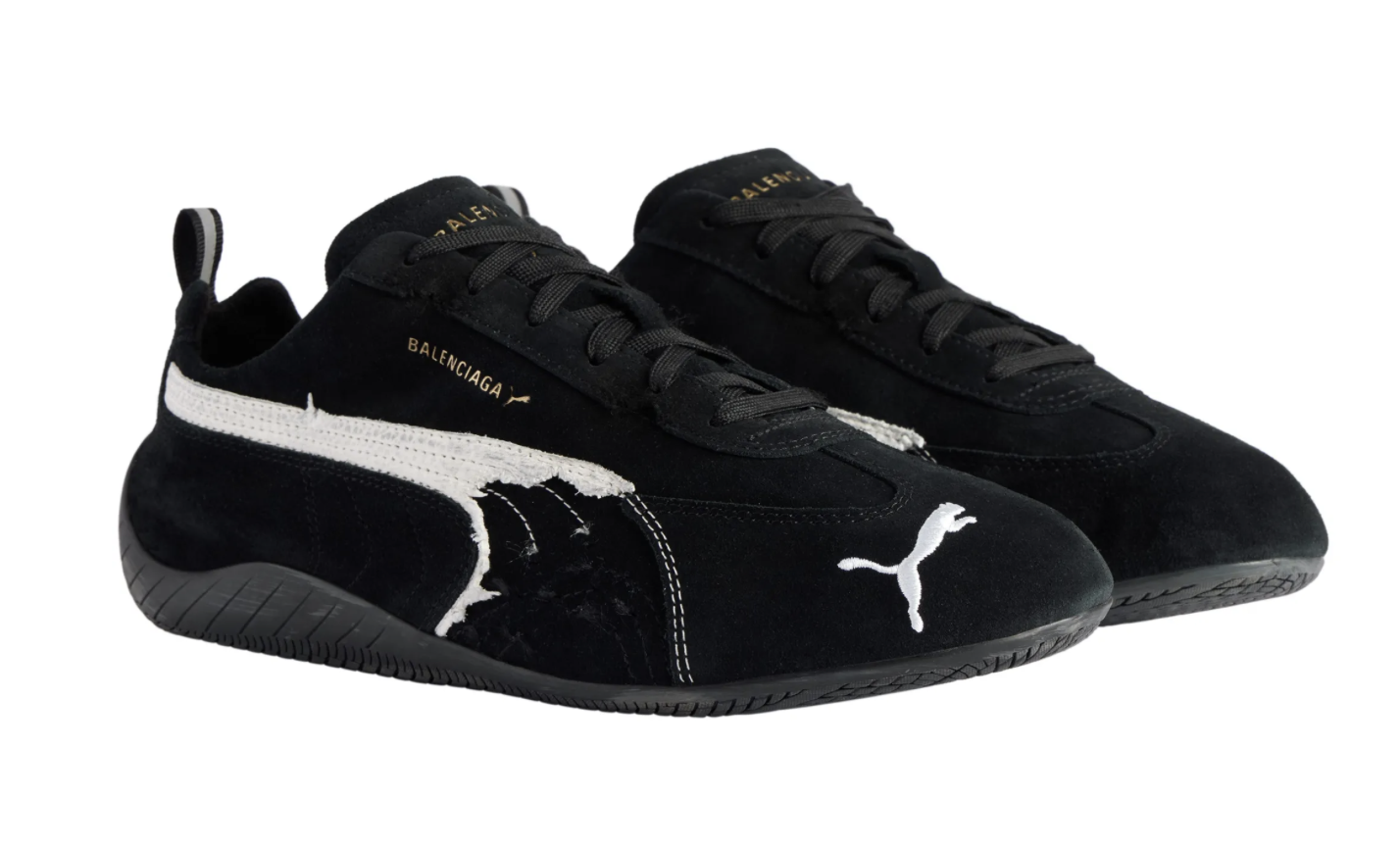 Balenciaga’s collaboration with Puma, launched in June 2025, reimagines the classic Speedcat sneaker with a high-fashion twist. Originally designed as a Formula 1 racing shoe in 1999, the Speedcat has been transformed by Balenciaga’s creative director Demna into a distressed, luxury version. The “Destroyed Speedcat” features a worn-out aesthetic, with a cut-off Formstrip and a pliable, sock-like feel, retailing at $685. This bold reinterpretation has sparked discussions in the fashion community, with some praising the innovative design and others questioning the pricing. Regardless, the collaboration has made a significant impact, blending technical sportswear with high-fashion elements.