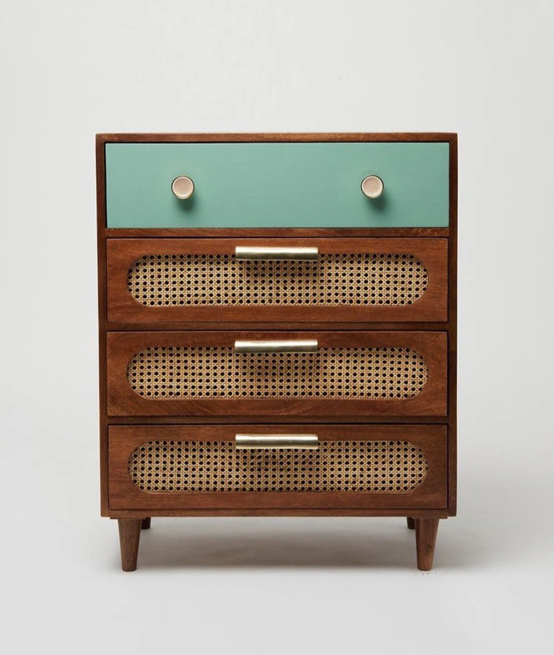 Pairing darkly-stained mango wood with pops of colour and hand-woven cane sheeting, Lakkadhaara’s Rattan Collection provides eclectic storage for your home. Drawing from mid-century furniture pieces, this Finola chest of drawers combines softly curved cut-outs in its bottom three drawers with hand-woven cane sheeting, and its top drawer is painted teal blue.