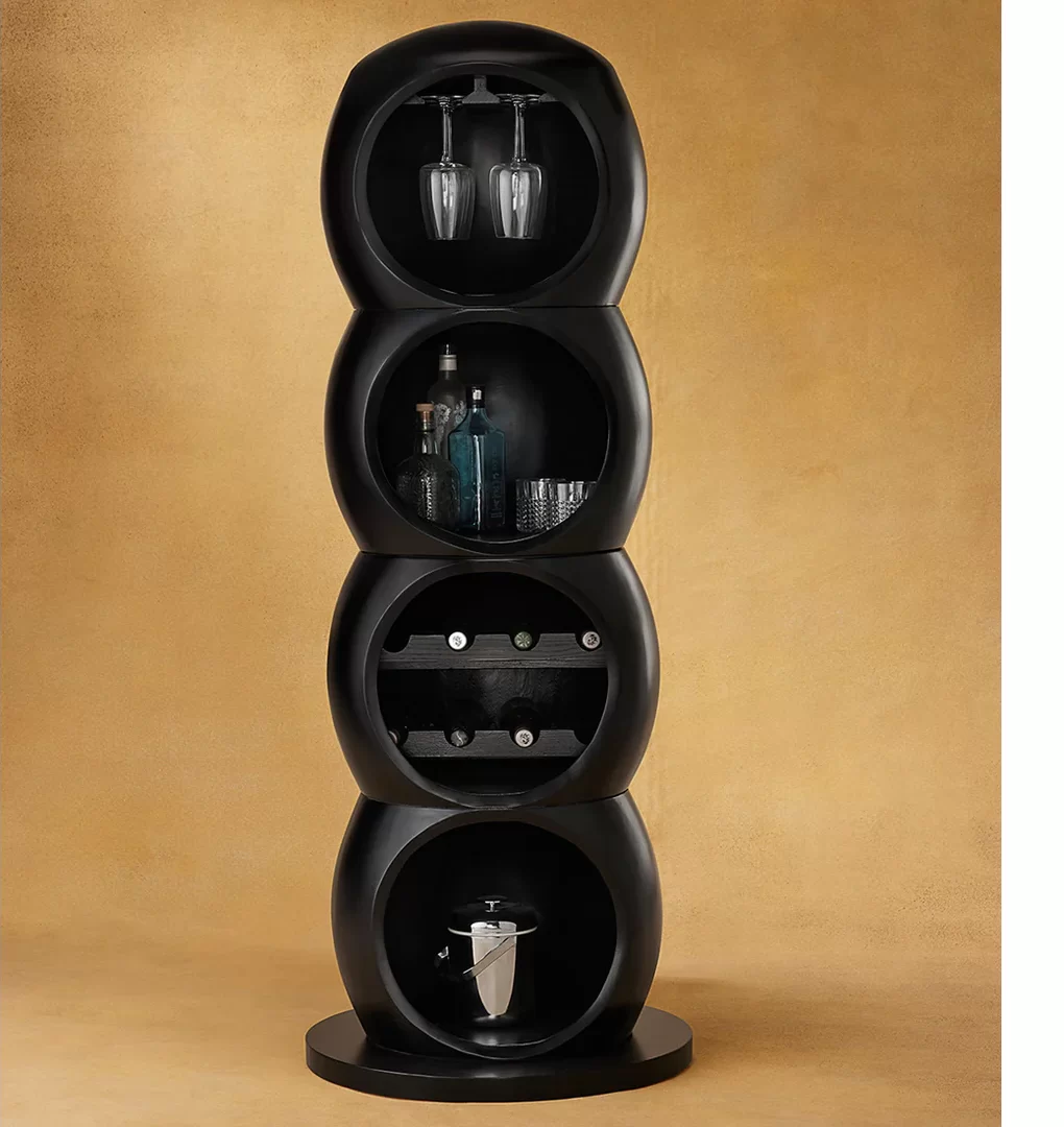 This cabinet can stand as beautiful a sculptural piece on most days, but come house party time when you give it a spin to reveal a hidden bar. The revolving mechanisms add fun to your party by surprising guests with a hidden stock of bottles. Crafted from White Ashwood and engineered for flawless turning of the bar segments, this caterpillar can stock stocks 20-30 bottles, wine bottles and wine glasses.