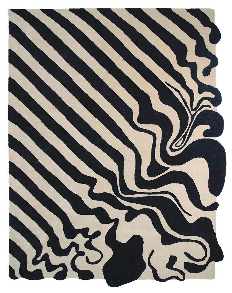 This rug starts with neat black-and-white stripes on one end but takes a dramatic turn as the lines begin to spill and swirl, creating pools of inky black at the other side. These opposite edges abandon their rectangular shape for curvier, free-flowing borders. It’s a rug that plays by its own rules, making it a striking centrepiece for any room.
