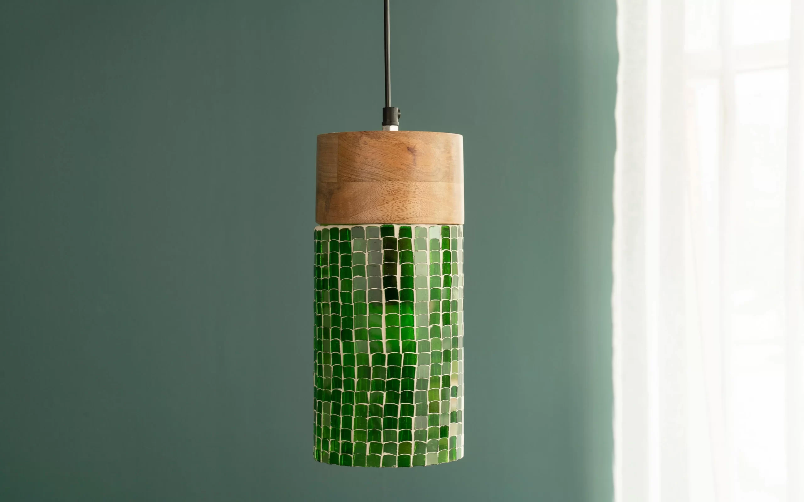 Part of Orange Tree’s Freedom Collection, this tall cylinder hanging lamp reimagines the ancient Roman art of glass mosaic with a modern twist. Tiny, perfectly aligned pieces of green glass are set in plaster, creating a glowing, textured surface. The wooden base brings warmth to the piece to balance the light out with your other wooden furniture.