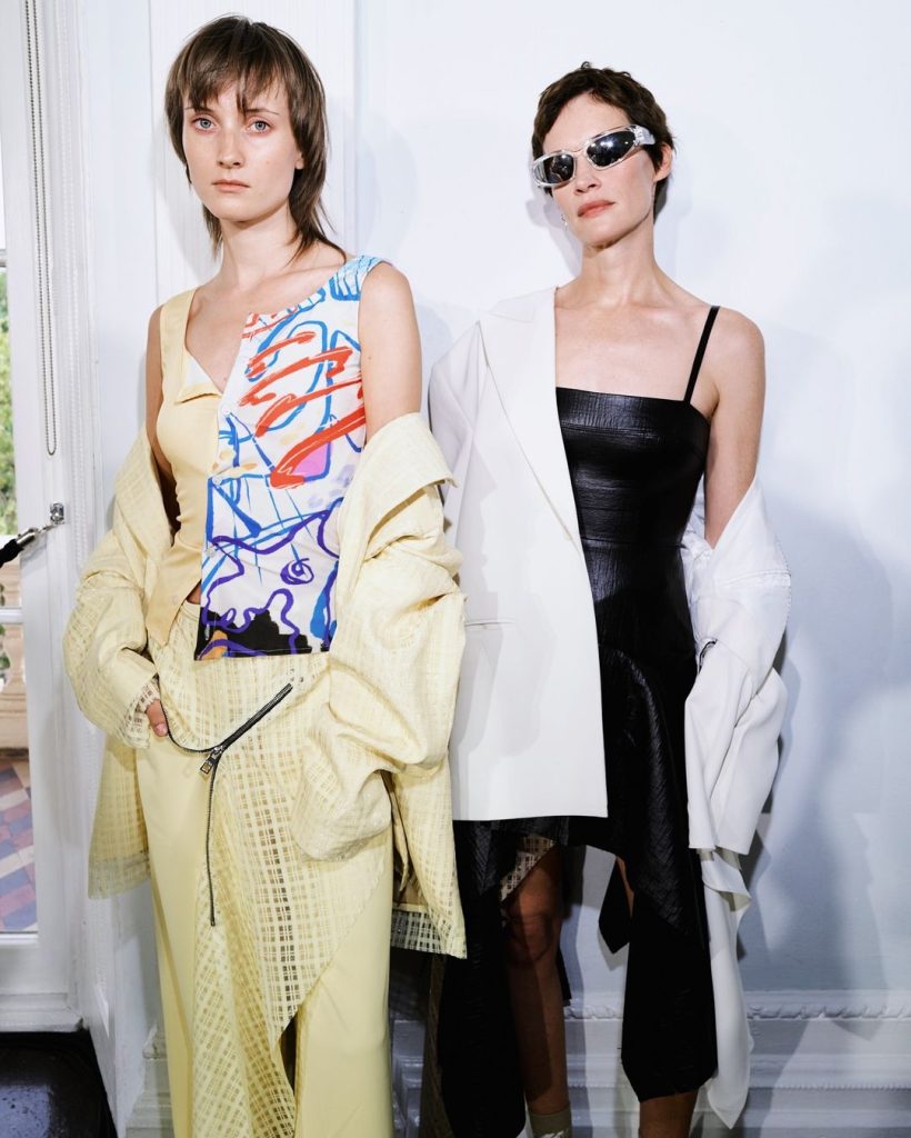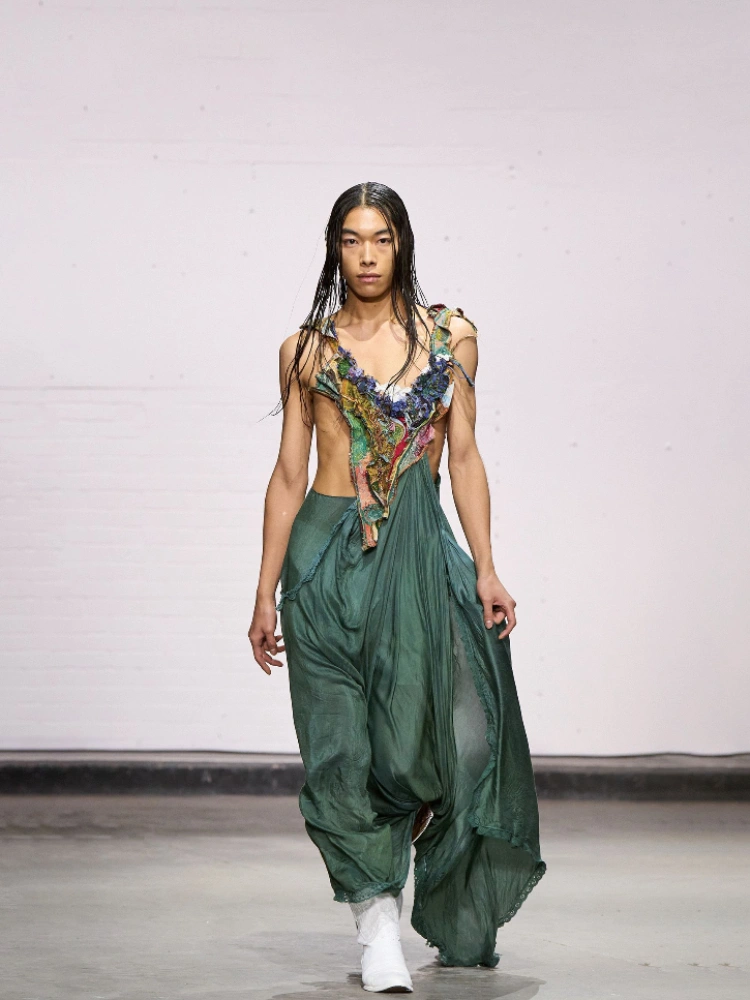HARRI quite literally stretched latex to its limits. Back for a second season under the British Fashion Council’s NEWGEN, the designer took over Old Selfridges Hotel with a spectacle that blurred the line between fashion and performance. Models moved in slow-motion sequences only to heighten the impact of ballooning jumpsuits, sculpted bodysuits, and zippered suits that warped and extended the human form. A restrained palette—black, khaki, burgundy, sheer green—kept the focus on shape, strain, and controlled distortion.