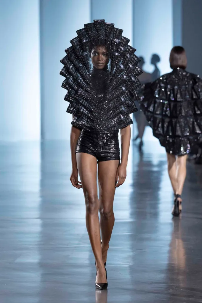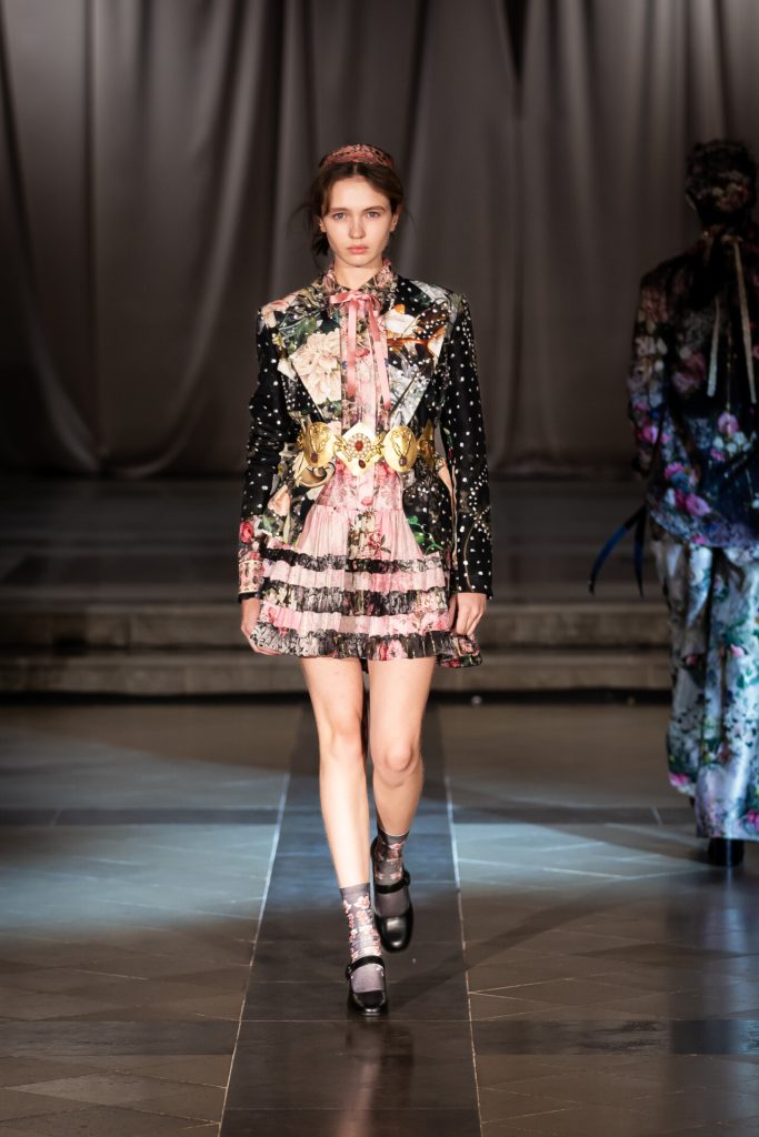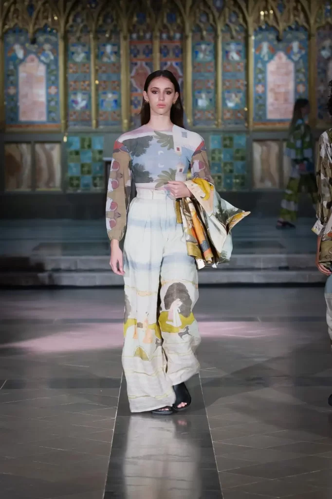Rahul Mishra’s The Pale Blue Dot placed human existence under a microscope, referencing Hindu philosophy and Carl Sagan’s Pale Blue Dot. Mirrors framed faces, embroidered landmarks seemed overtaken by nature, and birds broke free from bodysuits—each piece playing with perspective and scale. Gold arrived as the collection’s crescendo, draping utopian visions in embroidery: a deer curled up on a bed, glimpsed through a windowpane, a quiet scene set against the vastness of space.