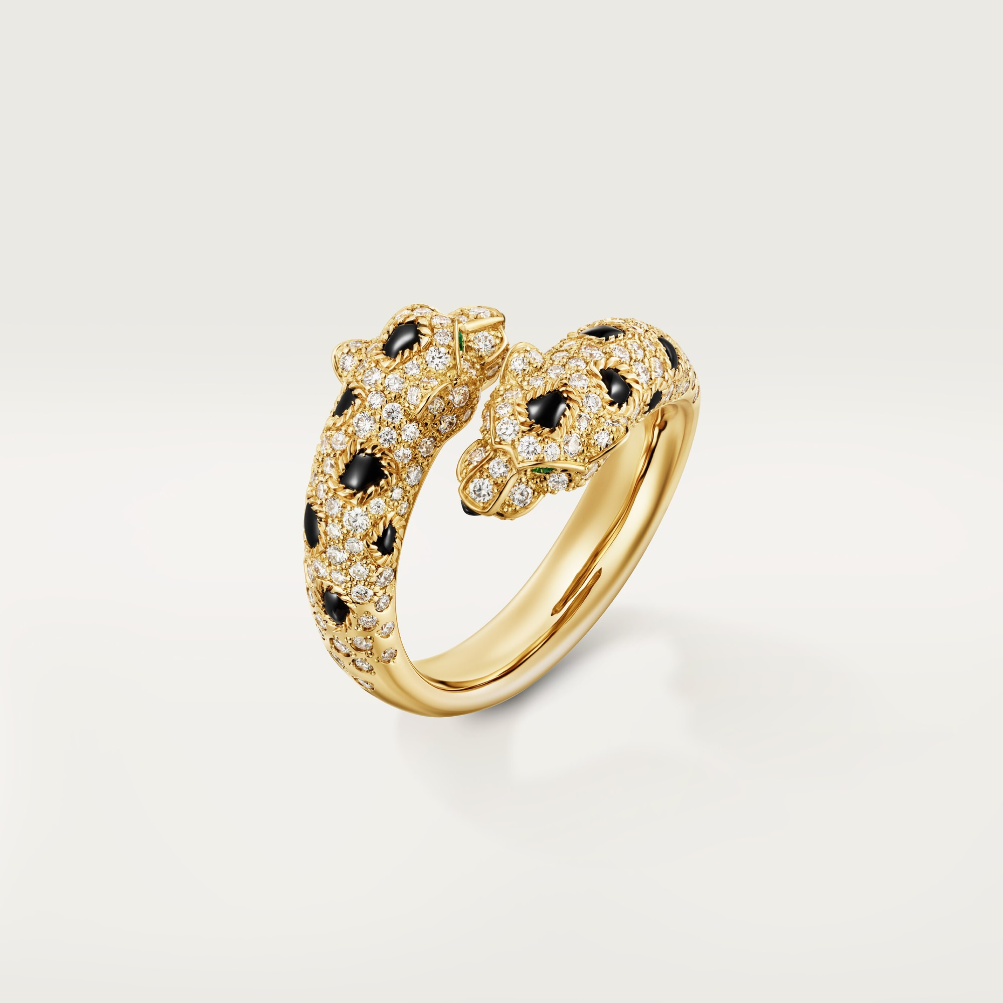 The panther, the symbolic animal of Cartier is the showstopper in Panthère de Cartier ring, a 18K yellow gold masterpiece set with 2 emeralds and 174 brilliant-cut diamonds totaling 0.92 carats.