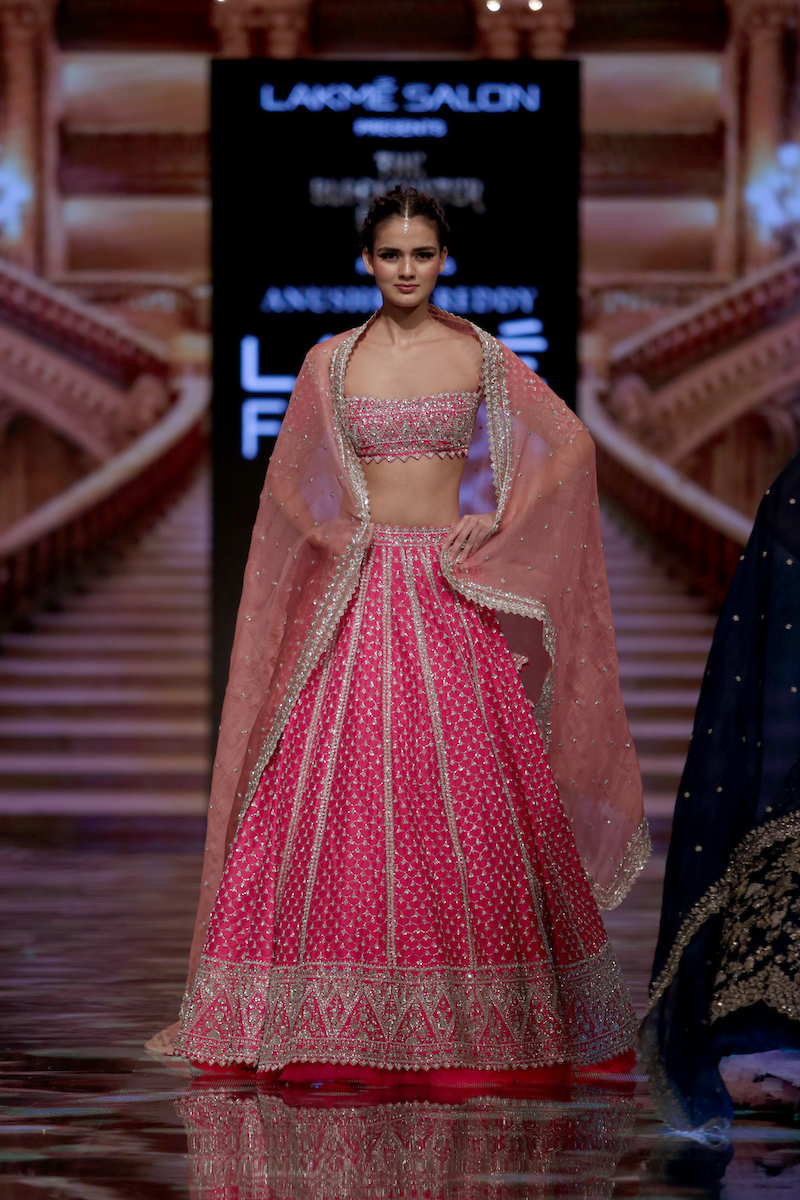 Known for her flattering bridal couture, Hyderabad-based designer Anushree Reddy takes inspiration from the word glamour. She reimagines lehengas for the modern bride in her Blockbuster Brides collection in gold, pink and red and recommends low-cut blouses, “Decorate these sexy pieces with laces to make them more attractive,” she says.
