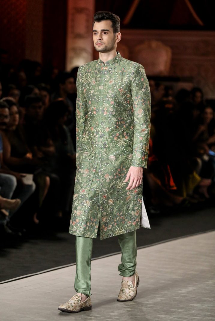 Shahid Kapoor’s wedding dress designer, Kunal Rawal makes a case for different shades of pink and blue. In his recent collection, Rawal experimented with hues of blue – dark navy, cobalt, denim blue, ice blue and beach blue. He also recommends deconstructed sherwanis, popular with new-age grooms for their redefined details. The deconstructed silhouettes are often a three-piece set, which doesn’t particularly follow the usual structure of a sherwani and combine traditional and modern elements of a kurta, a jacket and pants or a dhoti. The use of solar printing and photochromatic pigments, using threads dipped in bright dyes is also a great way to add a playful element to a groom’s outfit. “It would be fascinating to wear an all-white outfit, which instantly changes colour to mint or yellow when one moves from the indoors to the outdoors or vice-versa,” says Rawal.