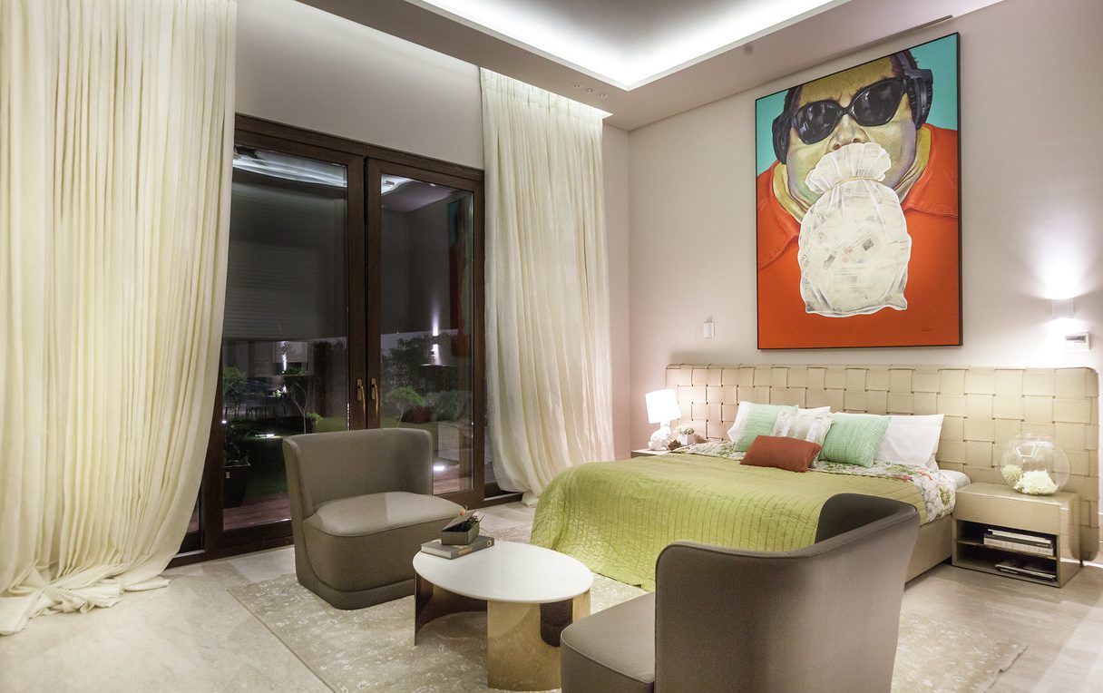 A look at the range of the accent furniture reveals the central theme of this posh property; sophisticated, minimal and a perfect conversation starter. From comfortable sofas with an elevated backrest to metallic-framed tables and strategically placed arty mirrors, home décor inspiration here is abundant.